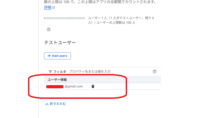 OAuth同意画面が「テスト中」の間は、テストユーザーに登録した Google