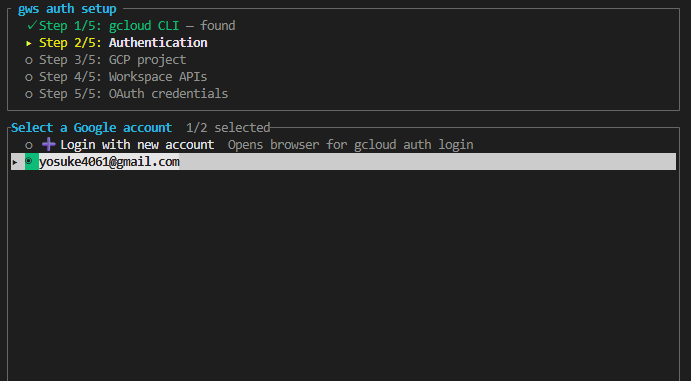 【注意】 GWS を利用するときは、先にターミナルで gws auth login を実行してログインしておいてください。表示された URL をブラウザで開き、権限を許可すると、以降のコマンドが使えるようになります。