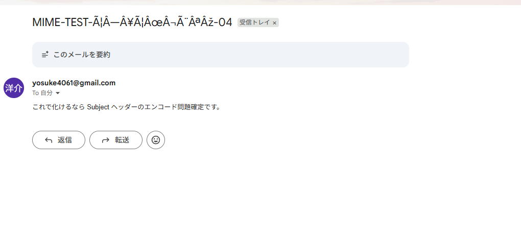 の生データのままヘッダーに書き込んでいるため、受信側(Gmail など)が正しく解釈できず文字化け(Mojibake)として表示されます。