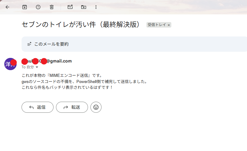PowerShell 側で MIME エンコードを補完して送信した例が以下です。件名「セブンのトイレが汚い件 (最終解決版)」が正しく表示されています。