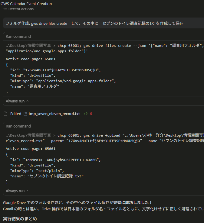 Drive では、gws drive files create でフォルダを作成し、gws drive +upload で指定フォルダにファイルをアップロードできます。Gmail の件名と違い、Drive のフォルダ名・ファイル名は日本語でも文字化けせずに正しく処理されます。