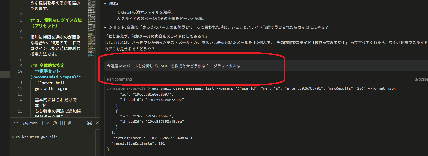 「今週届いたメールを分析して、SLIDEを作成」と自然言語で指示すると、gws で Gmail を取得し、内容を要約した Google スライドが自動作成されます。会議で「あのメールの内容をサクッと共有」するのに便利。