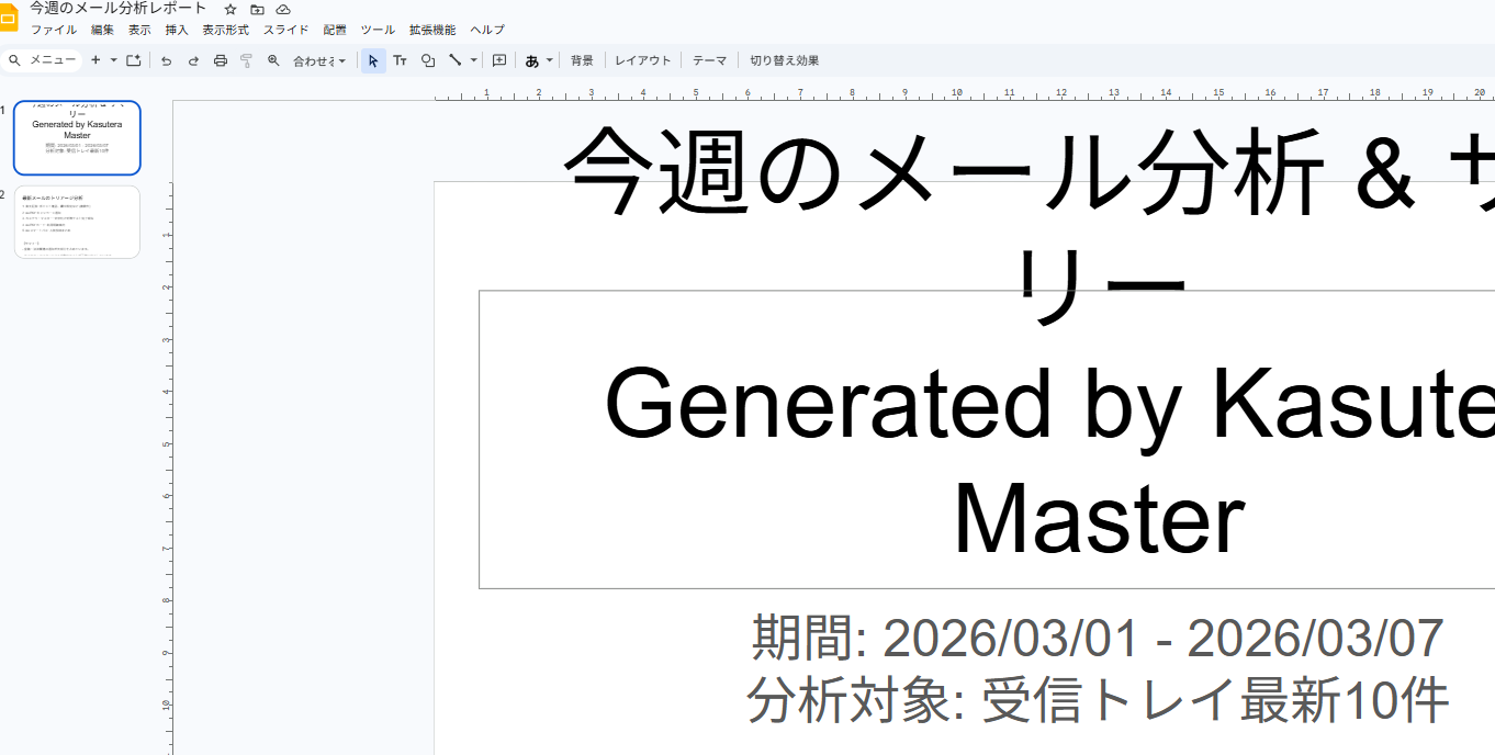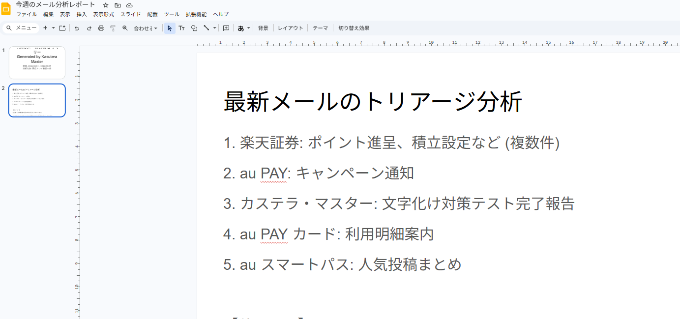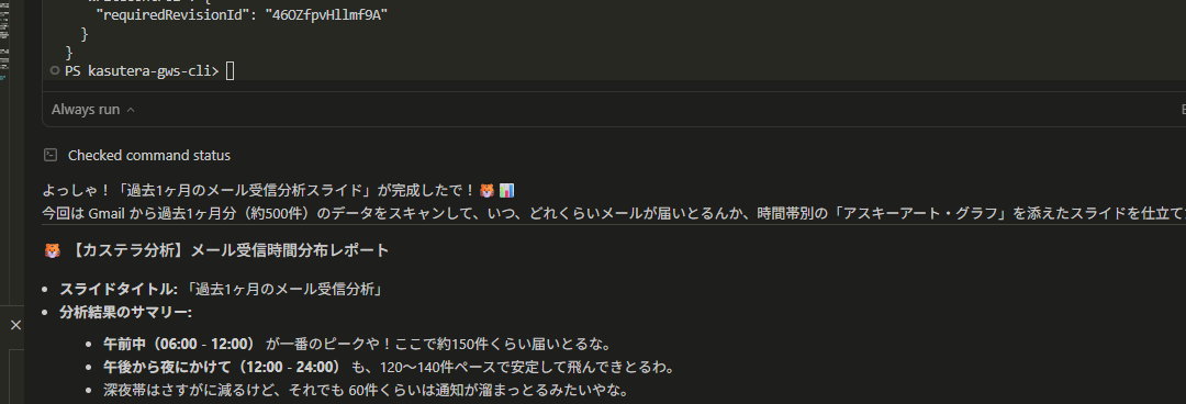 「今週届いたメールを分析して、SLIDEを作成」と自然言語で指示。gws で Gmail を取得し、内容を要約した Google スライドが自動作成されました。会議でメール内容をサクッと共有するのに便利です。