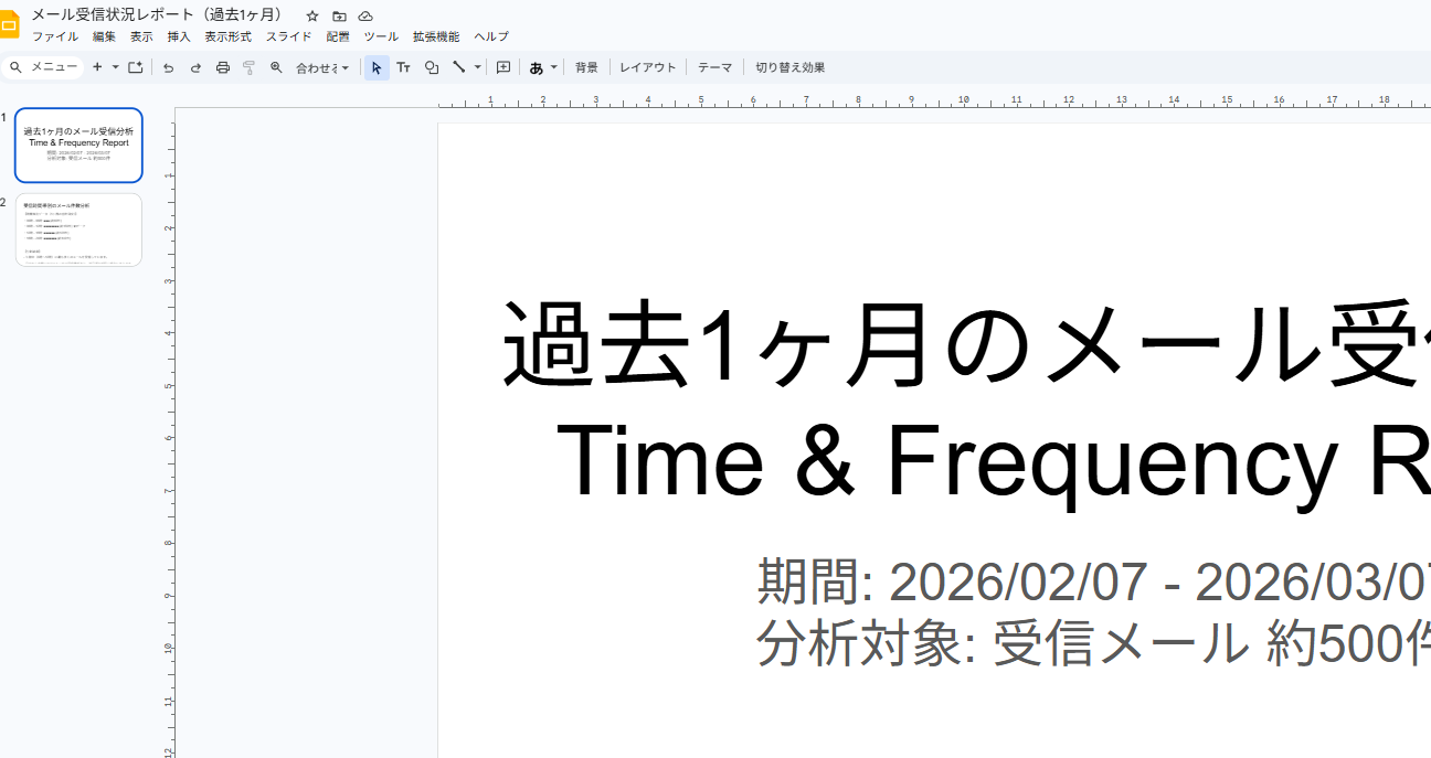 「メールで、過去1ヶ月間の受信した時間と件数をグラフで確認したい」と依頼すると、Gmail から過去1ヶ月分(約500件)をスキャンし、時間帯別の件数やピークをアスキーアートのグラフ付きでスライドにまとめてくれました。