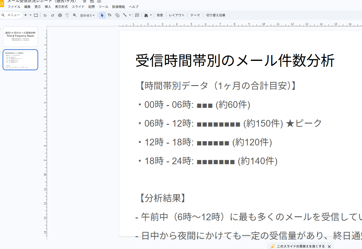 「過去1ヶ月の受信した時間と件数をグラフで確認したい」と依頼。Gmail をスキャンして時間帯別の件数・ピークをアスキーグラフ付きスライドにまとめてもらい、レポートや振り返りに活用しました。