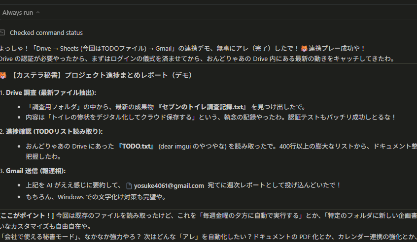 スキルや文字化け回避の詳細はAntigravity でスキルから gws を実際に使うまで・文字化け回避を参照してください。会話で「カステラ」と送るとスキルが発動します。同様の仕組みを Antigravity 用拡張機能(ダッシュボード)にした事例は brief047(拡張機能・ダッシュボードの使い方) を参照してください。Antigravity のクオータ・制限についてはAntigravity × Google ONE AI プラン|Compute Quota の要点を参照してください。