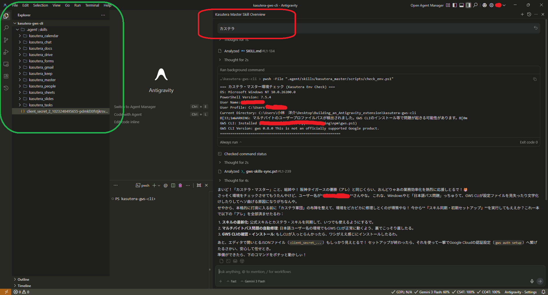 .agent/skills/kasutera_master/scripts/check_env.ps1が、gwsの有無・OS・ユーザー名・プロファイルパスを表示。ユーザー名に日本語(マルチバイト)が含まれると警告し、インストール失敗の可能性を案内する。 - 公式スキルの一括取得 —